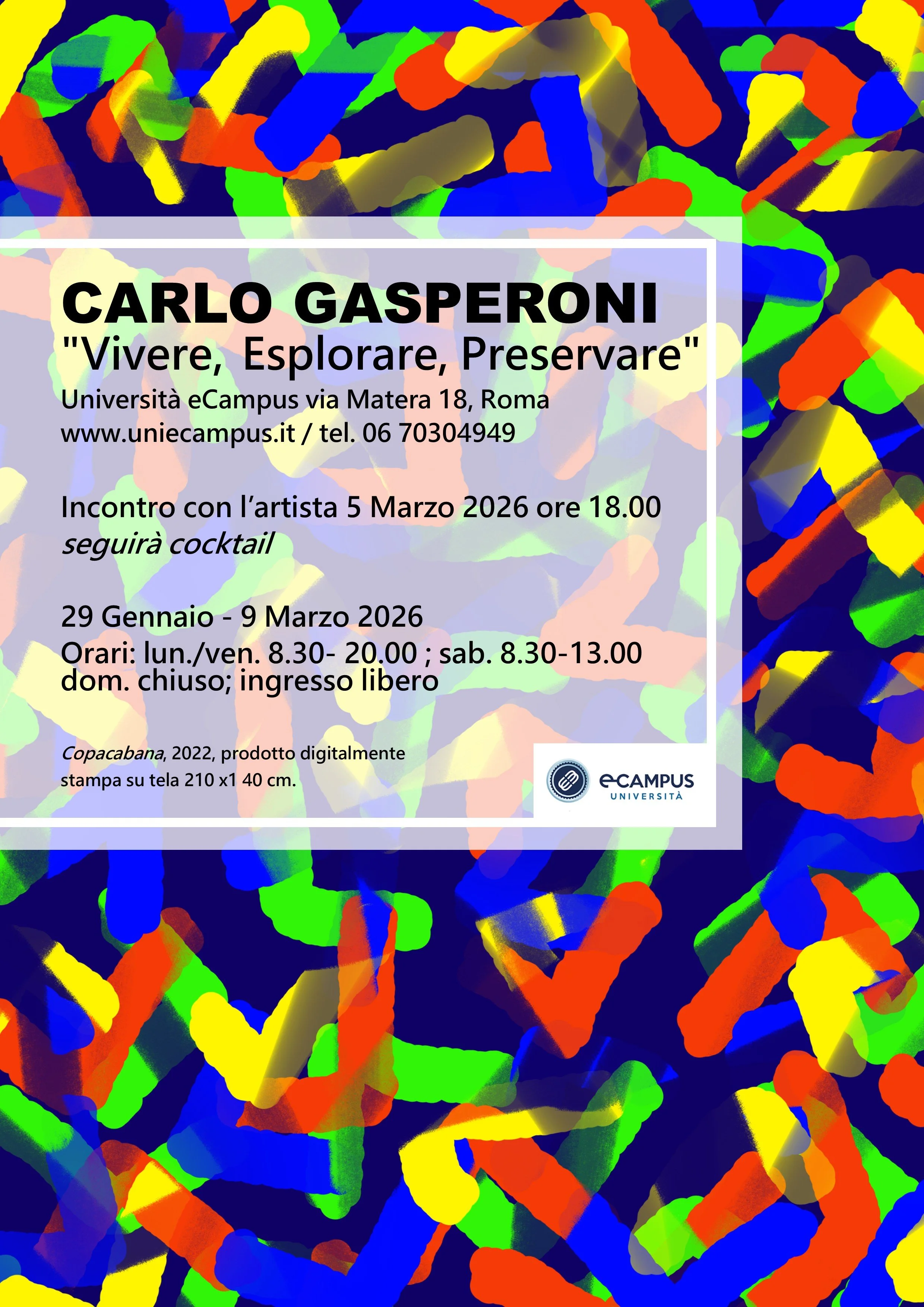 L’Università eCampus di Roma, in Via Matera 18, diretta da Rita Neri, ospita la mostra personale di Carlo Gasperoni, “Vivere, Esplorare, Preservare”, visitabile dal 29 gennaio al 9° marzo 2026. Attraverso un linguaggio personale che intreccia tradizione e sperimentazione, le opere del Maestro sviluppano una riflessione profonda sulle criticità del mondo contemporaneo, con particolare attenzione ai temi legati all’emergenza climatica. La conferenza di approfondimento della personale si terrà il 5 marzo alle ore 18, alla presenza dell’artista. Nel corso dell’esposizione sarà possibile studiare il lavoro di un autore capace di portare progetti concepiti in ambito digitale, composizioni astratte, dove il gesto creativo si trasforma in segni fluidi ma decisi in uno spazio sospeso tra atmosfere leggere ed evocative. Il colore riveste un ruolo centrale: declinato in tonalità brillanti e fluorescenti, diventa chiave interpretativa di ogni narrazione. Pur prediligendo un linguaggio informale, a tratti pop, i lavori rimandano al mondo naturale, ma anche allo spazio cosmico e al paesaggio urbano. L’eterogeneità iconografica crea una produzione ricca e variegata, in cui l’arte si configura quale strumento di comunicazione di valori universali.